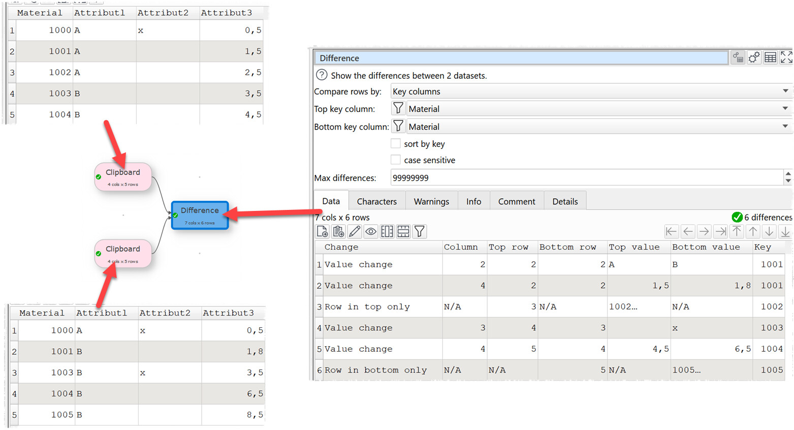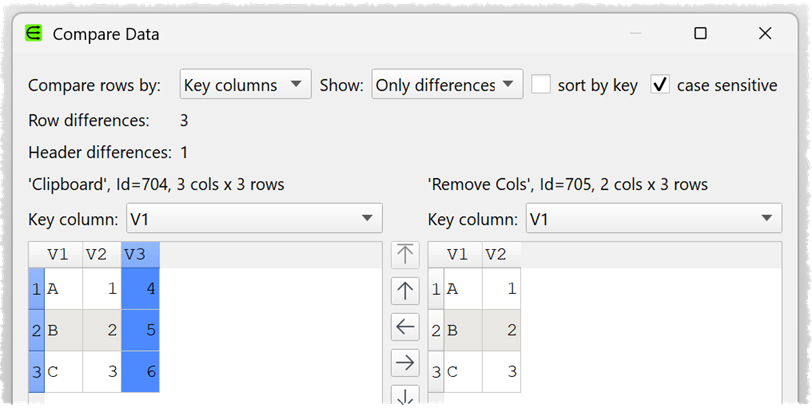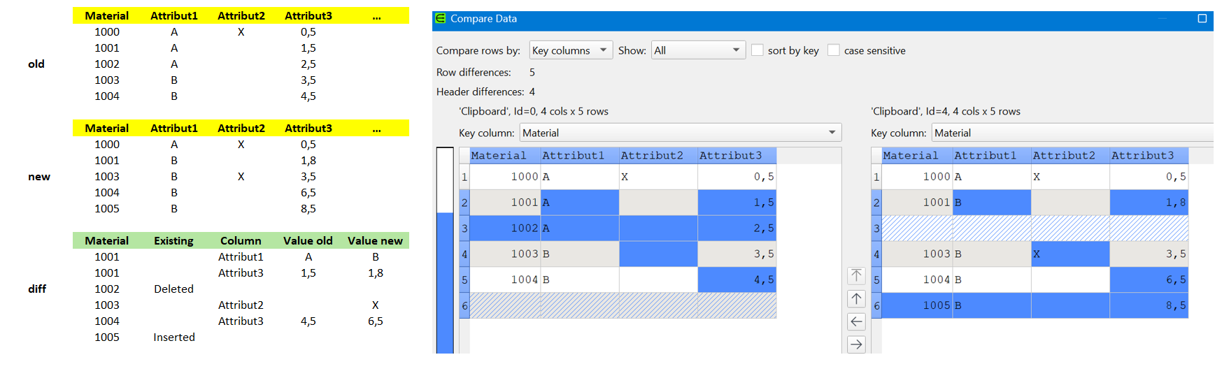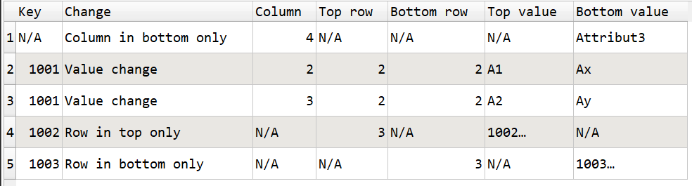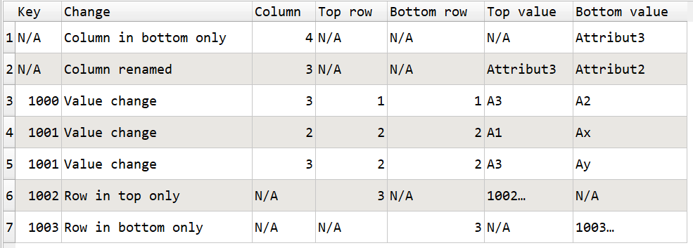 If a column is missing in the middle (e.g. Attribut2), this is declared as a missing column and also as renaming the column and all the rows are shown as a difference …