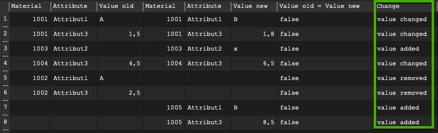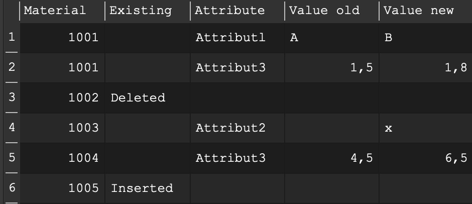 In my wishful thinking, the perfect differences-list will only contain the attribute-name and the old and new values per material-no.