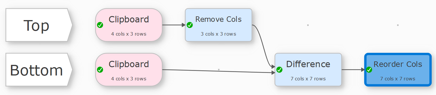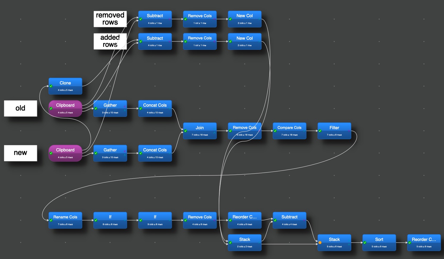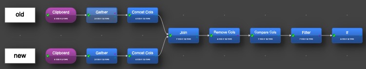 Note that you can Join 2 dataset by key or row number and then use Filter to remove rows where 2 values match in particular columns. This doesn’t really scale when you want to compare lots of columns though. Although I guess you could Concat Cols the columns you care about.